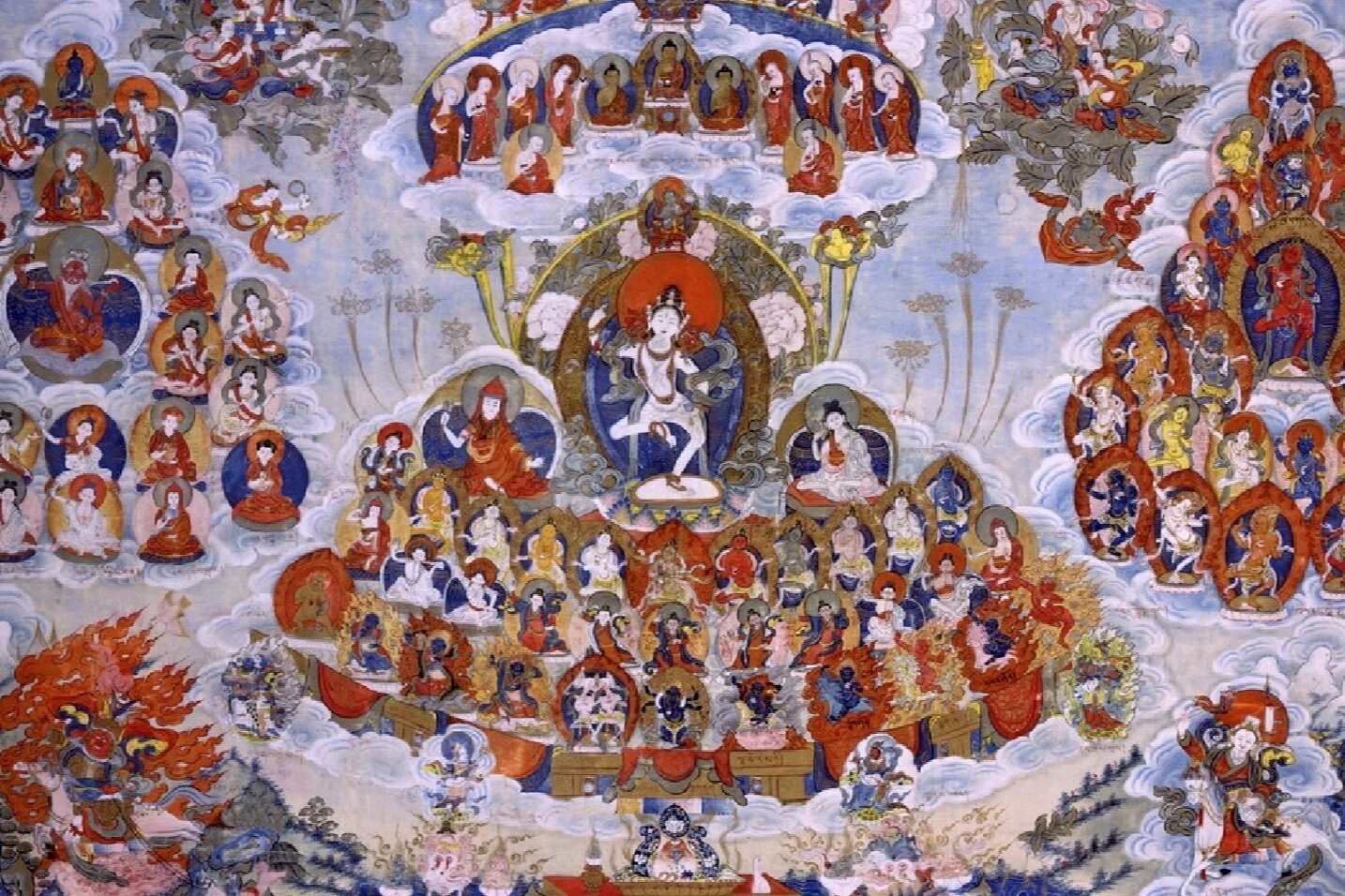 Machig first describes three kinds of gods. There are those who transcend both the karmic force of cause and effect as well as worldly existence itself; those who transcend the force of karma but intentionally engage in worldly existence; and those who are in no way transcendent, and who are still bound to the force of karma and samsaric life. The first category includes dharmakāya buddhas such as the Great Mother Prajñāpāramitā and Vajradhāra as well as the Buddha Amitābha and others. These beings are not tied to cyclic existence, but rather temporally exist in pure dimensions outside the confines of samsara. The second category includes saṃbhogakāya and nirmāṇakāya beings such as Śākyamuni Buddha and the “three lord” bodhisattvas Avalokiteśvara, Vajrapāni, and Mañjuśrī. These beings are not bound by karmic conditions due to their enlightened nature, but still engage with beings of the material world in order to liberate them from cyclic existence.